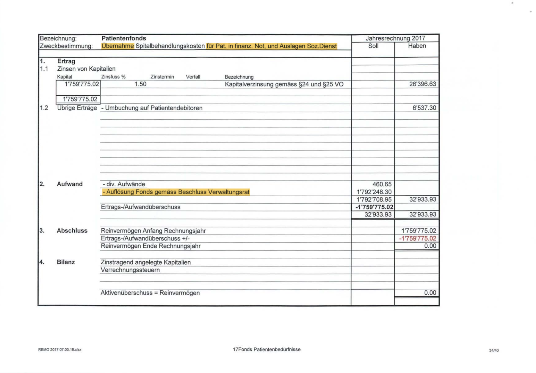 Ein Blick in die detaillierte Jahresrechnung (nur via Aktenauflage zugänglich), zeigt, woher der Geldsegen kam: zum einen wurden Rückstellungen zur BVK Sanierung in der Höhe von 2.15 Mio. Franken aufgelöst. Zum anderen wurde der Fonds für Patientenbedürfnisse klammheimlich aufgelöst, was nochmals 1.76 Mio. Franken in die Kasse spülte. Der Zweck dieses Fondes bestand in der „Übernahme von Spitalbehandlungskosten für Patienten in finanzieller Not und Auslagen Soz. Dienst“. Da wird sich der Spitalverwaltungsrat grosszügig gedacht haben, dass wohl auch ein ganzes Spital in finanzieller Not unter die Zweckbestimmung dieses Fonds fällt … und hat sich die 1.76 Mio. Franken kurzerhand in die laufende Rechnung zwecks Ergebnisaufhübschung einverleibt.