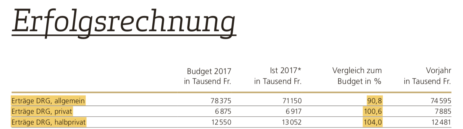 Ursache für das schlechte Jahresergebnis seien die Erträge, welche unter den Erwartungen geblieben seien, fuhr der Spitaldirektor fort. Grund dafür sei eine Verschiebung der Grippesaison und ein „Sommerloch“ bei den Patienten gewesen. Zudem hätte die von der Gesundheitsdirektion gewollte Verschiebung vom stationären in den ambulaten Bereich Wirkung gezeigt. Die ambulanten TARMED-Tarife seien für Spitäler aber nicht kostendeckend. Das mag alles zutreffen und ist so auch bei anderen Spitälern zu beobachten. Stutzig macht aber Folgendes: Weit hinter den Erwartungen blieben lediglich die Erträge aus den Fallpauschalen für allgemein versicherte Patienten (knapp 7 Mio. Franken oder fast 10% unter Budget). Das ist aber jene Patientenkategorie, an denen das Spital gemäss früheren Aussagen des Spitaldirektors gar nichts verdiene. Ein Einbruch in diesem Segment müsste also unterdurchschnittlich erfolgswirksam sein. Denn bei den Zusatzversicherten lag man im Bereich des Voranschlags (Privatpatienten) oder gar über Budget (+4% bei den halbprivat Versicherten).