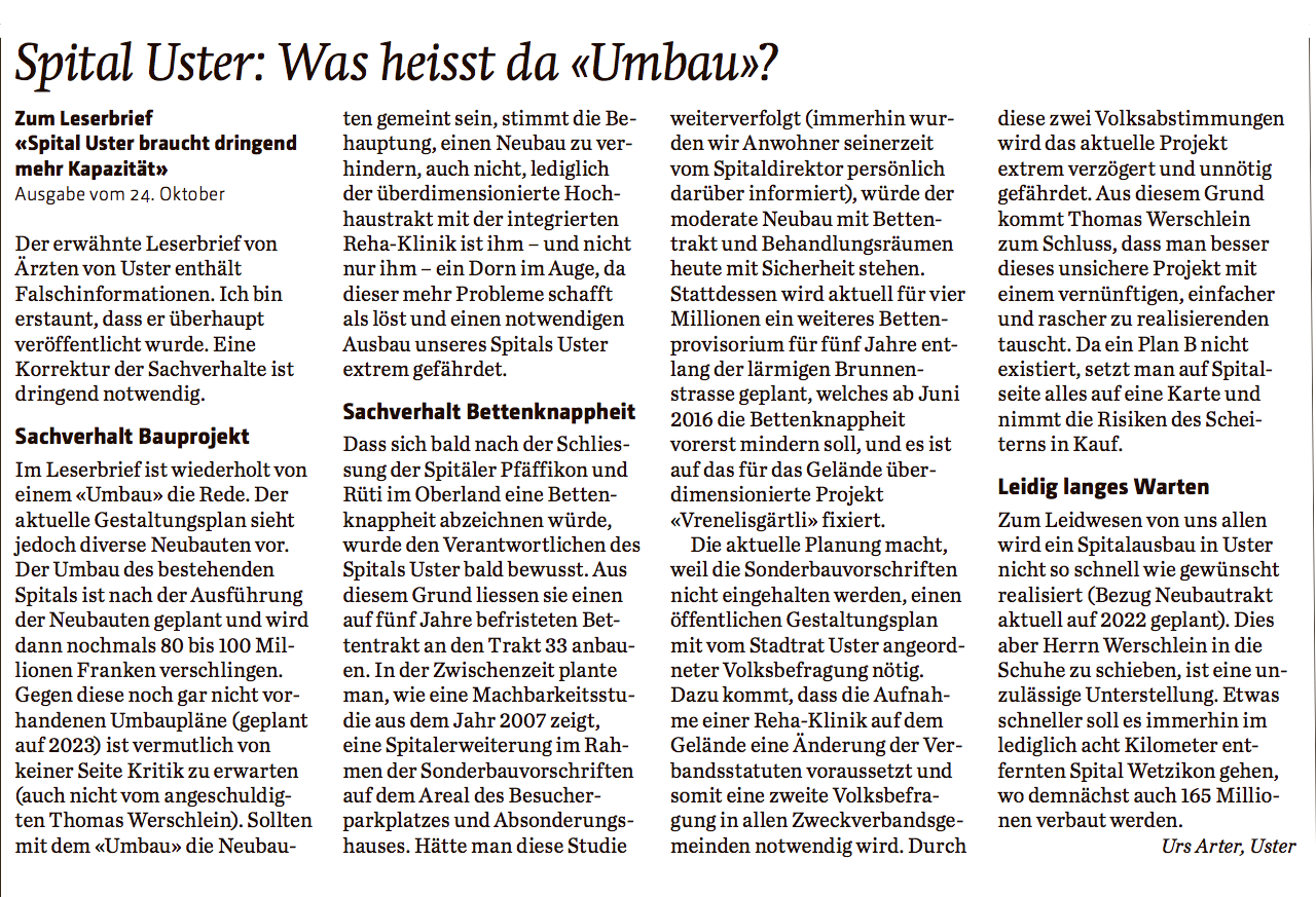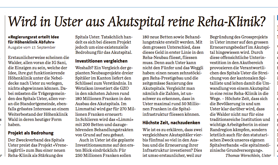 Der Wechsel zu einem wettbewerbsorientierten Gesundheitswesen sei kein Fehler gewesen, argumentiert Jan Hudec in der NZZ vom 3. April 2019. Darüber kann man geteilter Meinung sein. Für eine Debatte müssen aber alle Fakten auf den Tisch. Diesbezüglich staunt man über den Mut des Autors zur Lücke. Angefangen beim Triemli, welchem die Stadt ein prunkvolles Bettenhaus hingestellt habe. Die Stadt? Zitat aus der NZZ vom 7. November 2007 zum 290 Mio. Fr. Kredit: „Die Vorlage ist politisch nicht umstritten, auch die NZZ empfiehlt ein Ja.“ Die NZZ hat vor 12 Jahren offenbar ihre Hausaufgaben nicht gemacht. Und sie macht sie auch heute nicht. So wird behauptet, die geplante Fusion der Spitäler Wetzikon und Uster würde die beiden Häuser effizienter machen. Unerwähnt bleibt, dass beide Spitäler an ihren geplanten Bauvorhaben festhalten: Kostenpunkt 600 Millionen Franken für insgesamt 300 geplante Akutspitalbetten. Dabei musste das Spital Uster 2017 operativ rote Zahlen schreiben, nicht nur das im Artikel erwähnte Triemli. Auch die Darstellung der Fallkosten ist Rosinenpickerei: der Artikel legt den Fokus ausschliesslich auf die Schlusslichter Waid und Triemli, deren durchschnittliche Fallschwere mit einem CMI von 1.07 in beiden Spitälern zudem relativ hoch liegt. Die nächsten klassischen Regionalspitäler am (teuren) Ende der Fallkostenliste sind dann aber bereits die Spitäler Männedorf (Aktiengesellschaft), Affoltern (Zweckverband) und Uster (Zweckverband). Am günstigsten sind die Behandlungskosten hingegen am Spital Limmattal (Zweckverband). Es besteht also weder eine Korrelation, geschweige denn eine Kausalität, zwischen der Rechtsform eines Spitals und seiner Wirtschaftlichkeit. Für ein vollständiges Bild müsste die Leserschaft auch darüber aufgeklärt werden, dass in der GZO Spital Wetzikon AG eine ausgeprägte Bonuskultur herrscht. Und sich das Spital um die Submissionspflicht seines Bauvorhabens scherte. Der kürzlich erfolgte Leitentscheid des Bundesgerichts blieb in der NZZ bislang unerwähnt. Warum wird über die Spitäler Wetzikon und Uster der Mantel des Schweigens gelegt? Und die Leistung des Zweckverbands Spital Limmattal mit keinem Wort gewürdigt? Hängt das am Ende damit zusammen, dass die beiden Zürcher Oberländer Häuser unter FDP-Führung stehen, während das „Limmi“ unter SP-Leitung steht? Ist die NZZ auf dem rechten Auge blind?